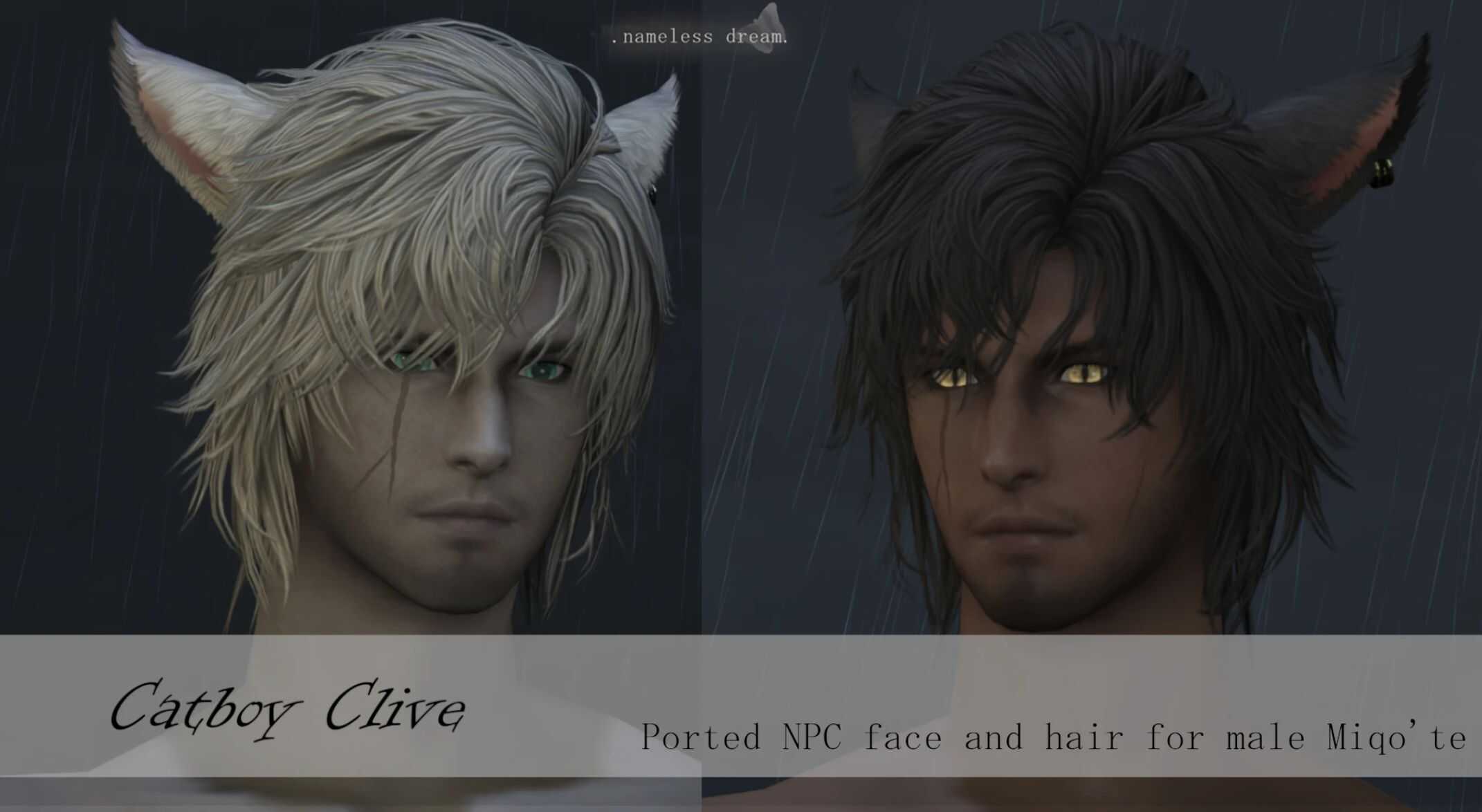 This is a port using weight transfer method (keeps original model and textures) of Clive’s hair and face for male miqo’te.