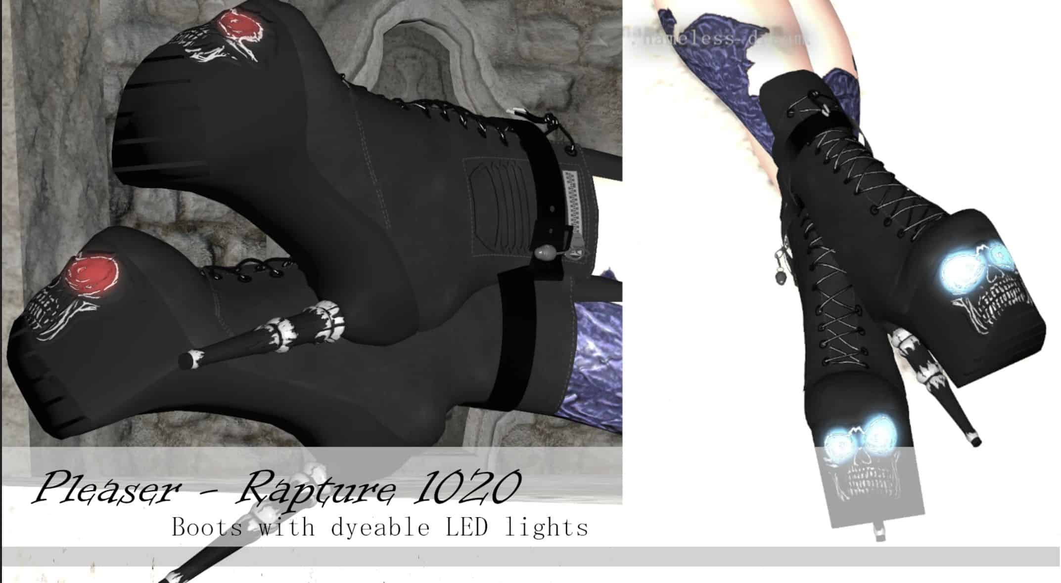 This is a from-scratch recreation of Pleaser’s Rapture-1020 boots with a dyeable LED glow on the skull’s eyes (channel 1).